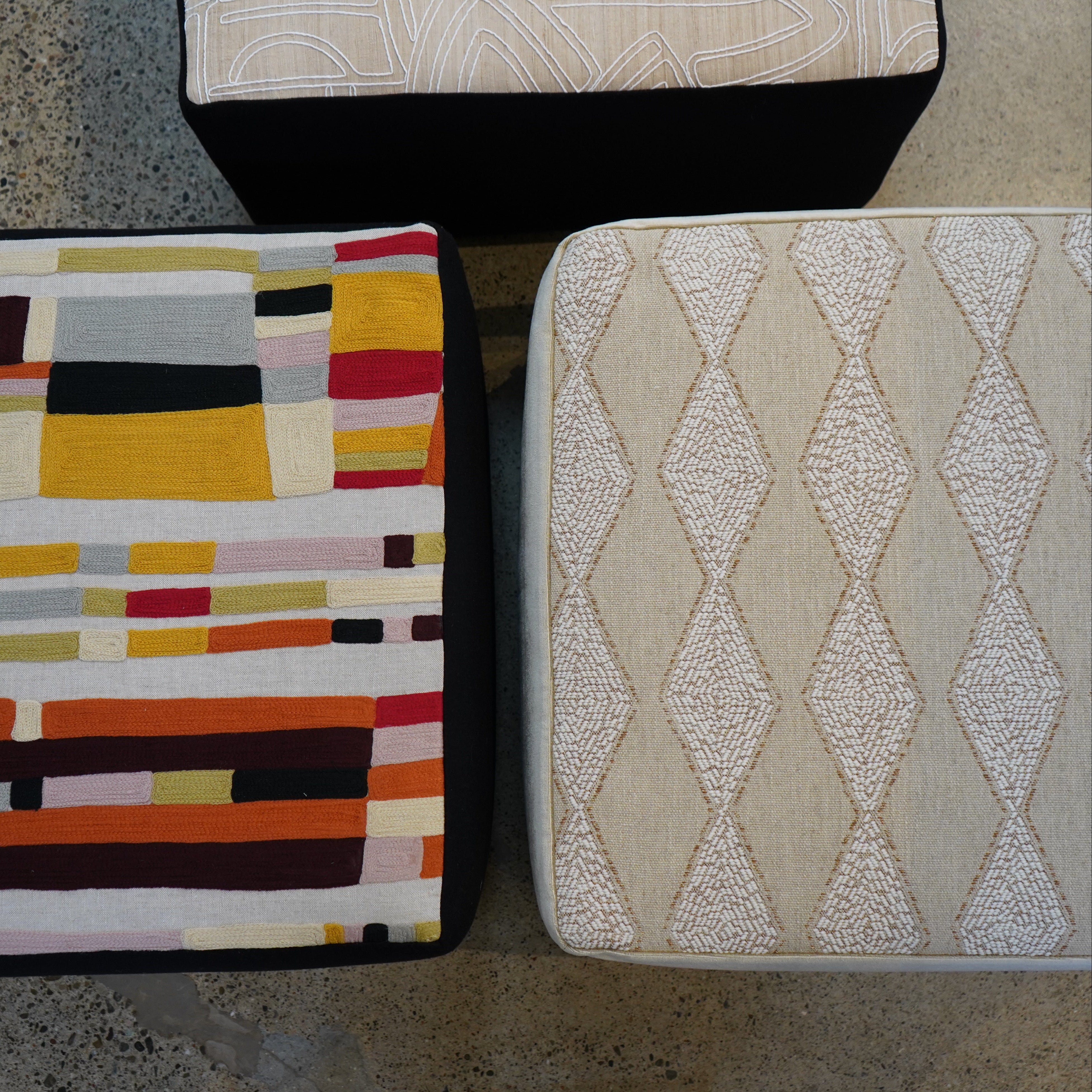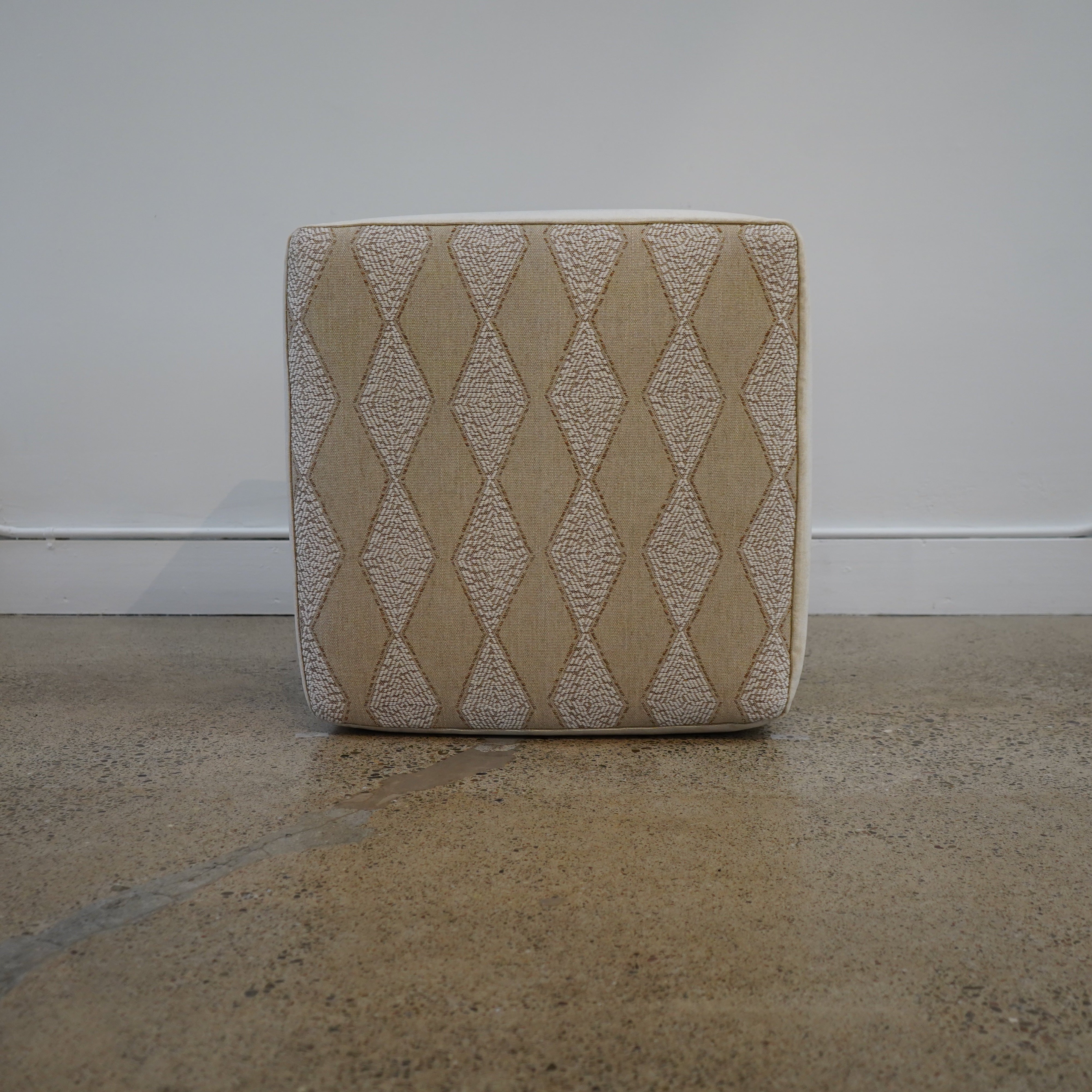 A tan and warm white diamond pouf upholstered in Pierre Frey fabric, featuring intricate beaded detailing that adds texture and subtle dimension. Refined yet expressive, this piece works beautifully as extra seating or a sculptural accent in any space.