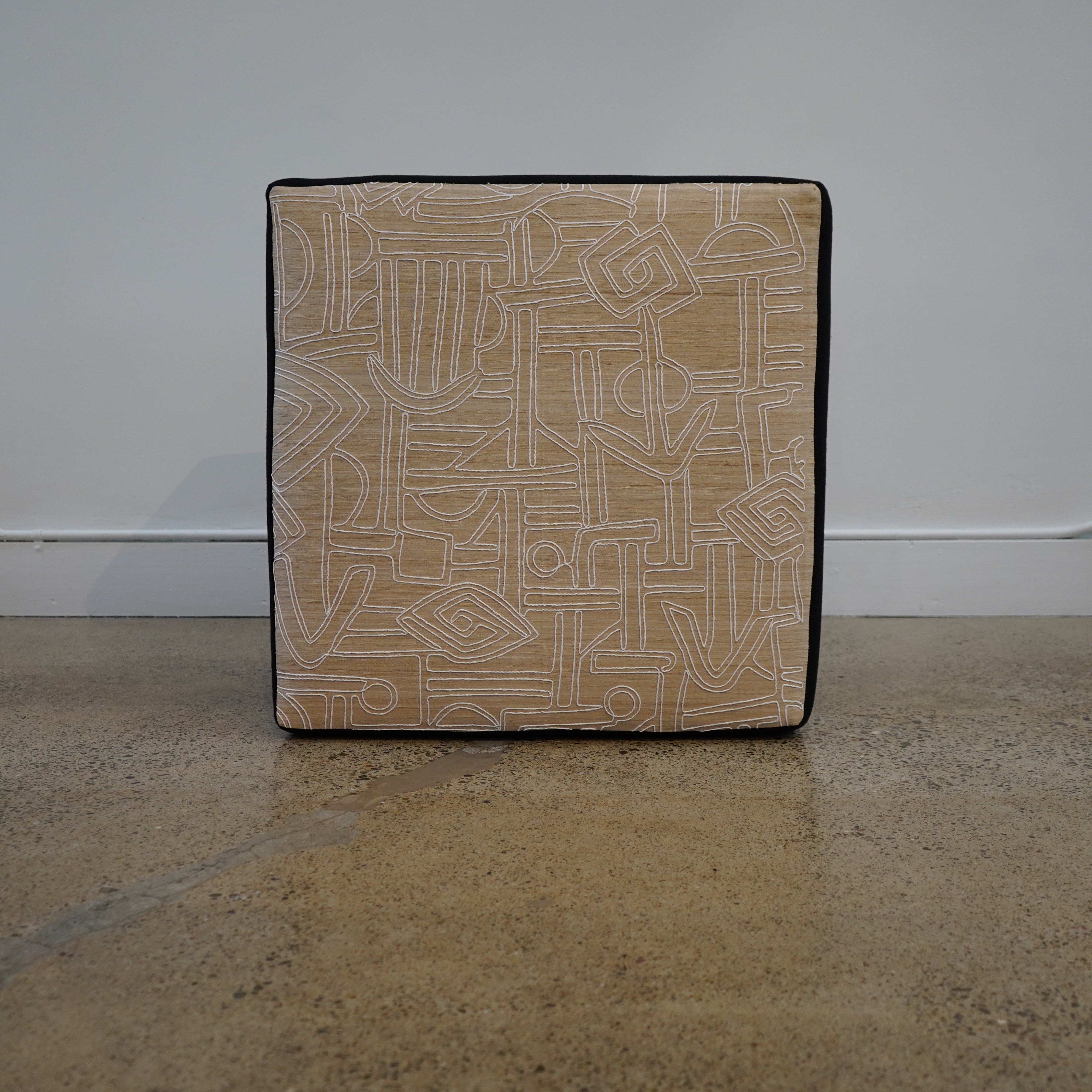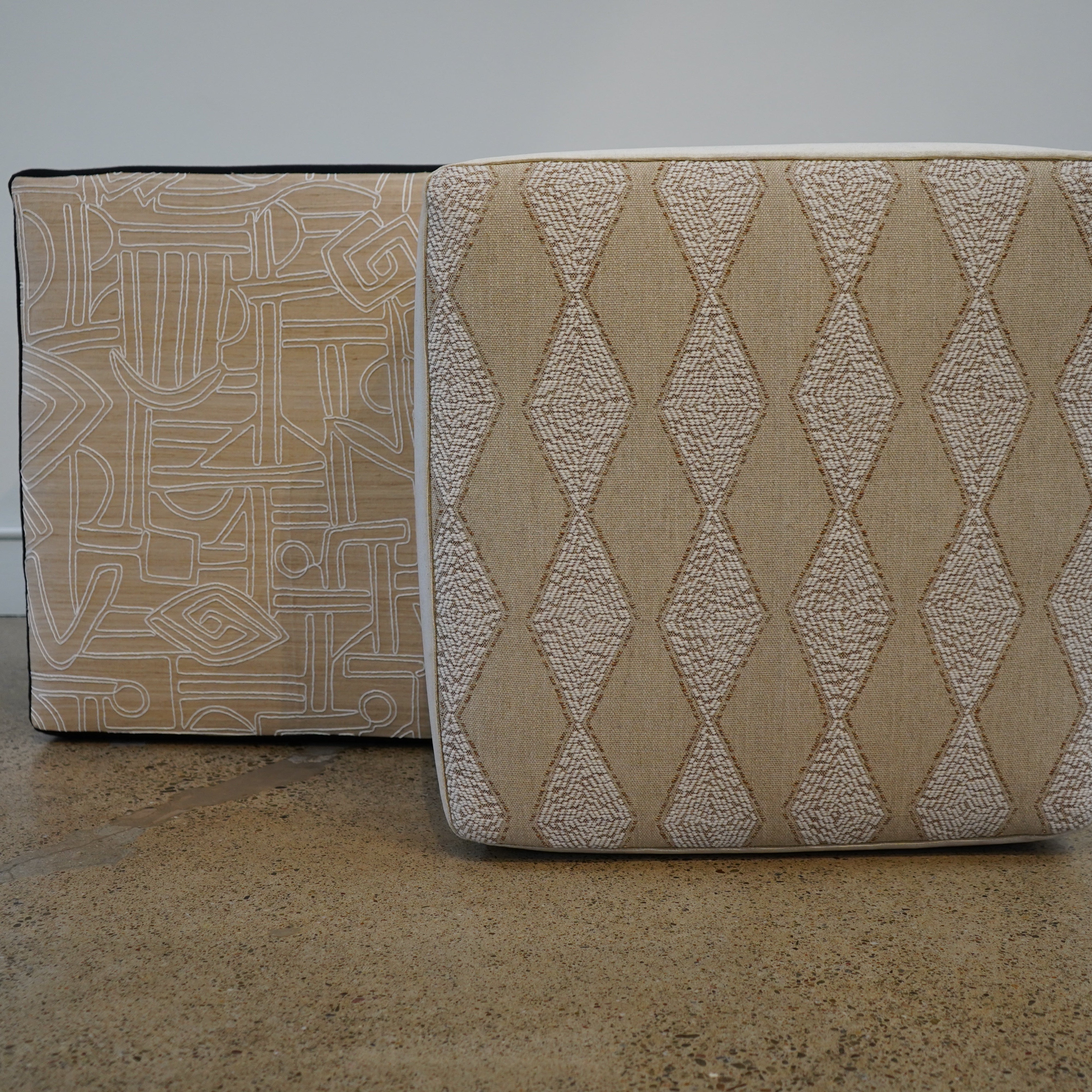 The Desi Line pouf, designed by Camino, is upholstered in Pierre Frey fabric and features a soft neutral palette with subtle linear detailing. Timeless and beautifully crafted, it adds texture and quiet interest to a space while working effortlessly as extra seating or a sculptural accent.
