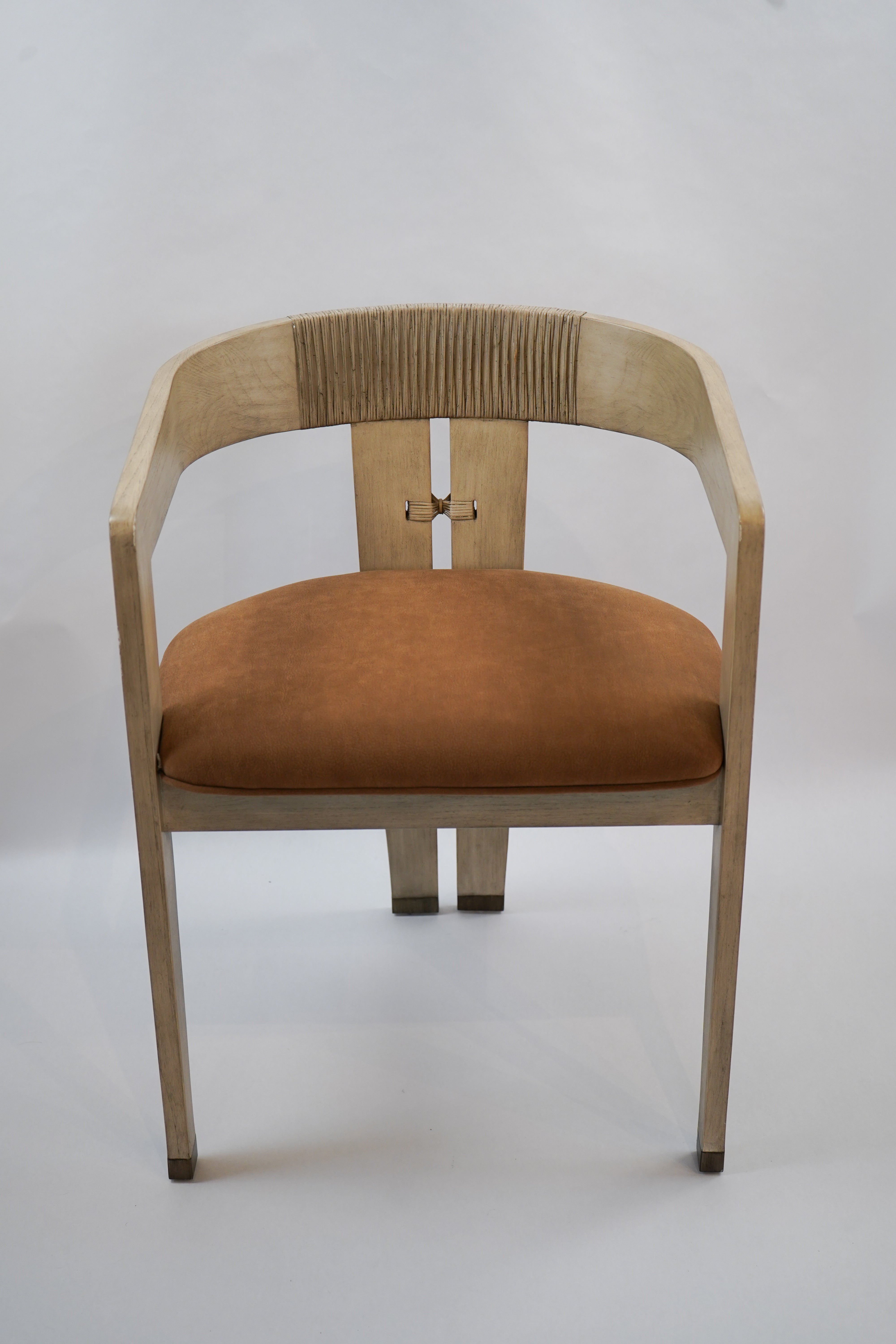 A set of four custom Sangkai wood dining chairs with sculptural frames and softly upholstered seats. The curved wood construction creates a balanced, architectural silhouette while offering comfort and support for everyday dining. Thoughtfully crafted and versatile in style, these chairs pair easily with both modern and classic tables, adding warmth and refinement to the room.