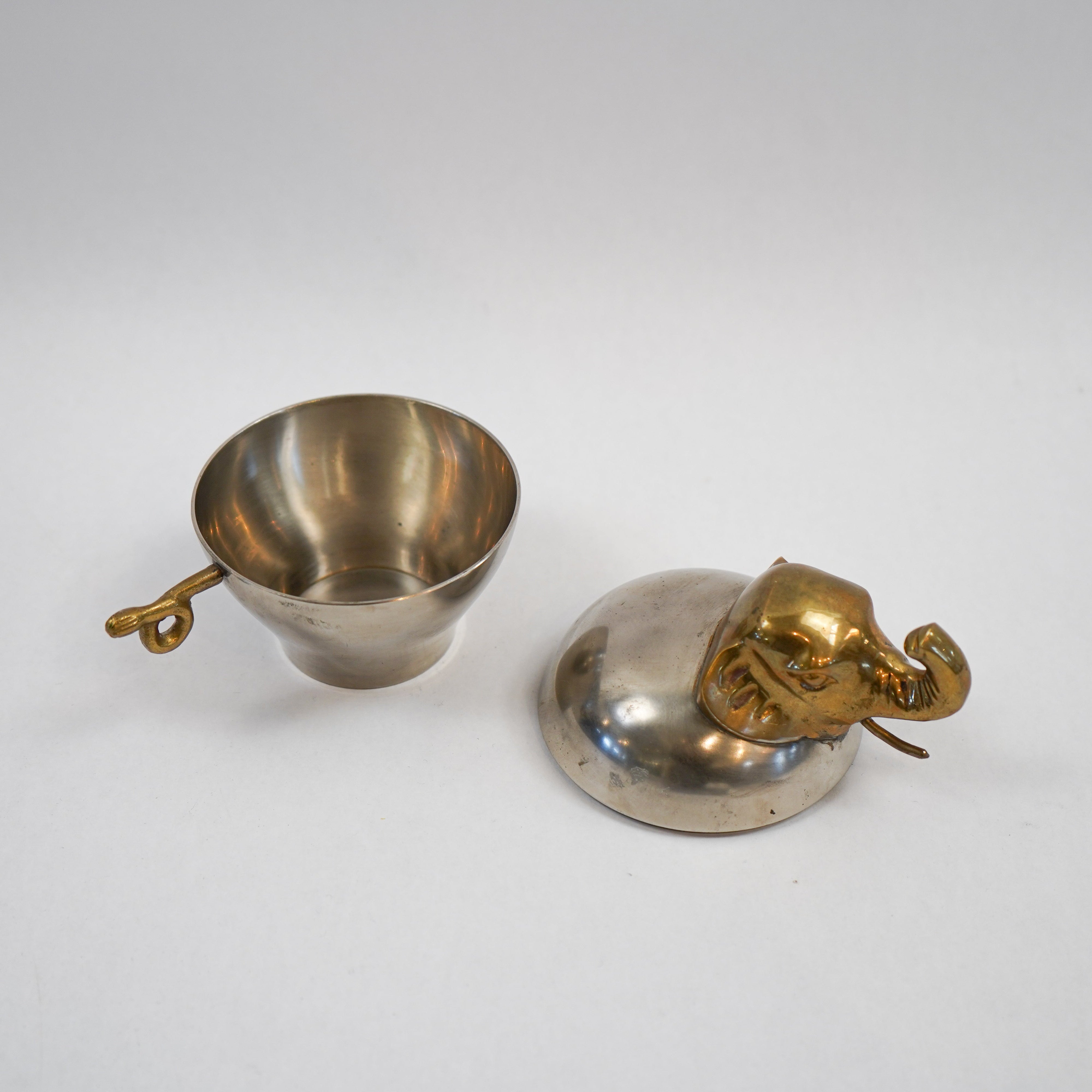 A charming vintage trinket box crafted in mixed metals, featuring a sculptural elephant form in brass set atop a silver tone vessel. Rich in detail and character, this piece balances playfulness with craftsmanship, making it both a functional storage object and a decorative accent.